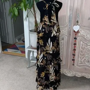 • Halter-style straps with self-tie bow at back, cut-in shoulders