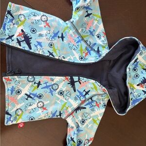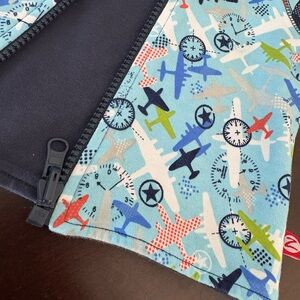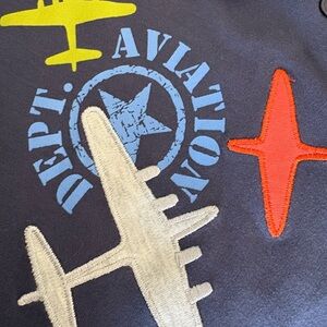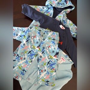 This listing is selling as a matching set, new without tags never worn never laundered, 3 shirts 1 pants and 1 hoodie. All blue shades with airplane them. Completely interchangeable. Hooded jacker is reversible to solid navy, pockets on both sides. Button up down collared long sleeve. Plane design pullover. Blue with sewn on designs top. Pants are elastic waist pull on. All high quality and super soft that will last!