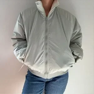Oversized and thick reversible puffer jacket with ribbed trim and zipper closure pockets for both sides. One side is sage green and the other side is ivory.