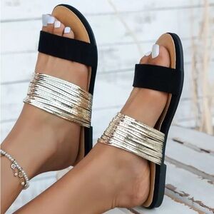 Stylish sandals with black and gold straps. Perfect for casual outings. PU leather casual open toes slides true to size US9.5