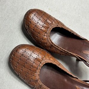 Classic Schultz women’s leather slingback heels in rich brown with perforated detail — perfect for dressy casual looks, work outfits, or an evening out. Lightly worn, clean, and in great shape. Questions welcome — my goal is for every customer to be fully satisfied with their purchase!