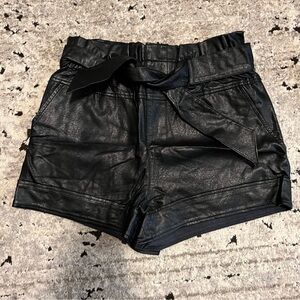 Stylish high waist shorts with a sleek leather look. Features a tie belt for added flair. Ideal for both casual and dressy occasions.