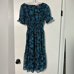 Stunning Kate Spade teal and black floral midi dress, perfect for any occasion! This dress features: