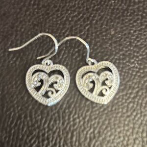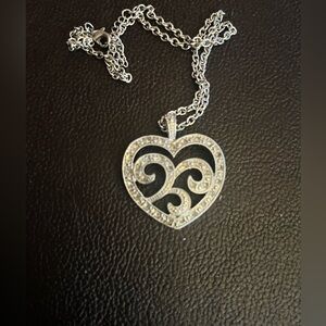Elegant silver heart pendant necklace with intricate swirl design and matching earrings. Perfect for adding a touch of sophistication to any outfit.