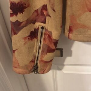 Chic bomber jacket with autumn floral design. Features beige and burgundy hues. Perfect for casual outings.