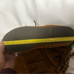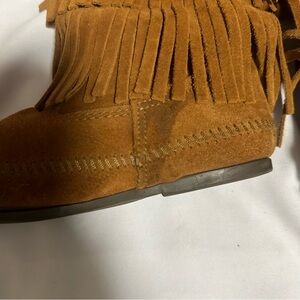 Chic moccasin boots with layered fringe. Crafted from soft suede. Ideal for a boho look.