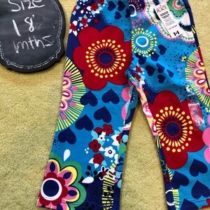 Bright pants with a floral design. Features blue, green, and pink hues.