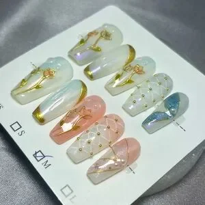 Chic nail set featuring floral and geometric designs. Includes white, pink, and blue nails with gold accents
