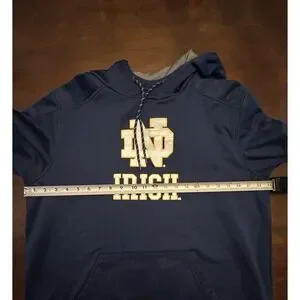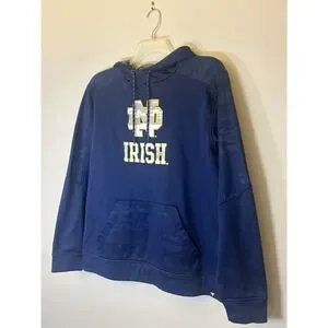 The product is a men's XL navy blue camo hoodie featuring the official logo of the Notre Dame Fighting Irish, a college football team. Made by Fanatics, this officially licensed sweatshirt is perfect for fans looking to show their support during the regular season. The hoodie is designed in Egypt and is a must-have for any die-hard Irish football enthusiast.