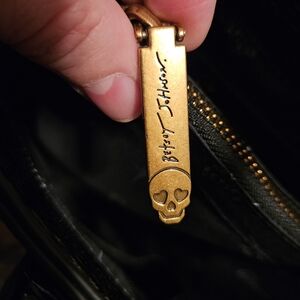Inside the purse is the Betsey Johnson Signature black with white logo. Lining has 2 large compartments that are separated by a zip closure divider pocket in the middle. 2 open slip pockets and a zip closure pocket. Has a fold over clasp closure with a magnetic button snap.