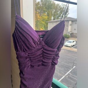 Turn heads in this stunning B. Darlin ruched mini dress in a rich purple shimmer fabric with a flattering bodycon fit. Perfect for parties, club nights, and special occasions. Features a sparkly lurex finish, stretchy nylon-blend fabric, and a hidden back zipper for a sleek silhouette.