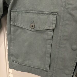 Lightly worn Madewell jacket, chino fabrication, utilitarian style with functional flap pockets on front, concealed snap and zip front opening, button functionality at wrists that allow for a cinching effect if desired, classic collar, faded blue green color, 22” pit to pit, 22” top of shoulder to bottom hem