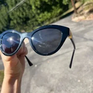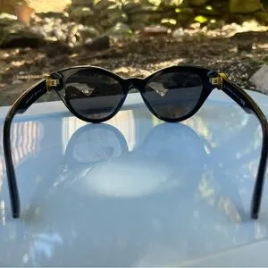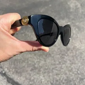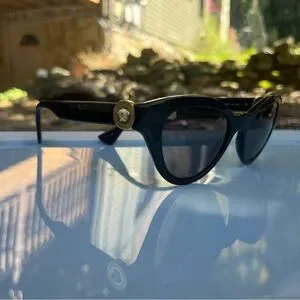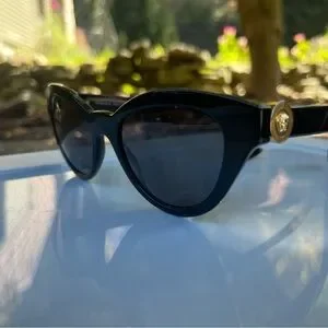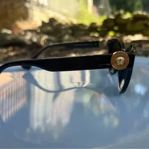 Sophisticated Versace pre-loved sunglasses in sleek black. Features iconic gold Medusa medallion detail. Perfect for a stylish look. There are scratches and dings but not noticeable and they don’t impend vision. They’d be great for the beach/pool and looking sassy while gardening! Comes with case.