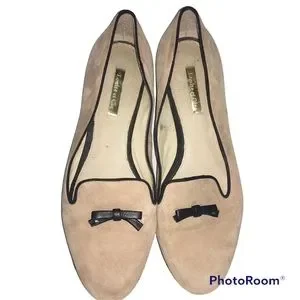 Nice pair of flat loafers in a soft pink suede with black trim. These are the Anniston floats. They have a half inch heel. Size 8.5. Good preowned condition there are a few small spots on the inner lining as shown in photos.