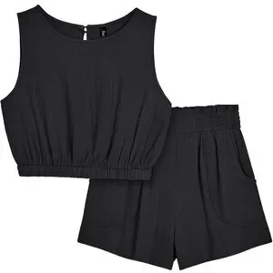 Elevate your wardrobe with this sleek black sleeveless tank top and short set. Perfect for any occasion, it offers both style and comfort.