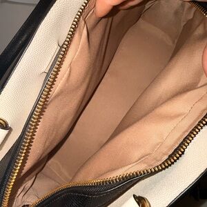 brand new, never carried!! Authentic Coach Lillie tote in a beautiful black, white, tan, and beige multi-color leather combination. Features gold-tone hardware and zippers, with a center zip compartment and two side pockets secured by magnetic closures. The interior includes multiple slip pockets for easy organization, while a large slip pocket on the back adds extra convenience.