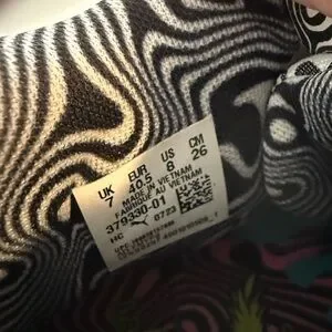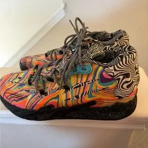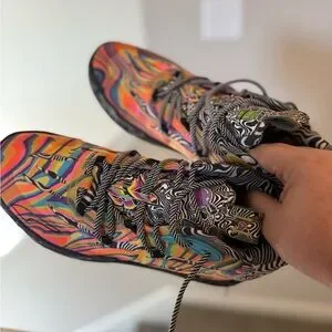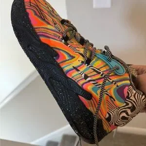 Vibrant sneakers with a multicolor pattern. Features black and white laces.