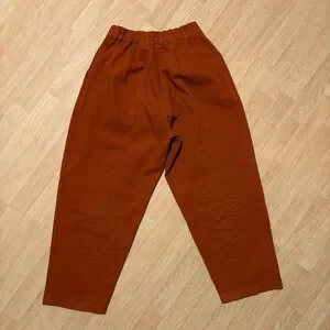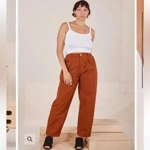 The classic pleated Trouser. One of our best-selling pants. Some may say the perfect pant. Made with our signature 9oz 100% cotton twill that we use for all of our pants and jumpsuits. Plenty of room for your hips in our trousers-- your butt is gonna love these. Excess fabric in the hip provides for a beautiful drape on those of us with narrower hips. Double-pleated. Big front pockets. Our twill does not have stretch built into the fabric but all of our pieces break in beautifully with wear and conform to your body with time. Garment dyed in a rainbow of our hues for durability and color quality.