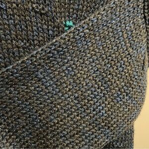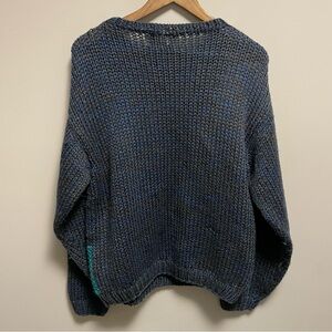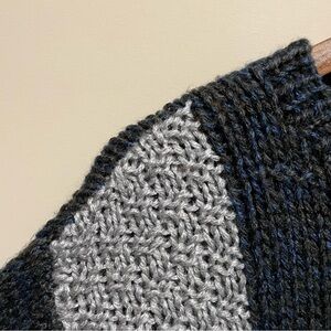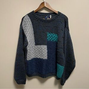 Stylish 90s vintage knit sweater in a mix of gray and blue in a colour block geometric pattern. Perfect for cozy days. Men’s large based on a 21 inch pit to pit measurement.