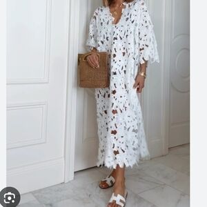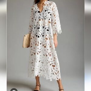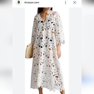 Floral Eyelet Kaftan dress. This white, midi-length, long-sleeved dress features a cutout and eyelet design.I wore this with a nude colored slip underneath it was a great look and very comfortable.