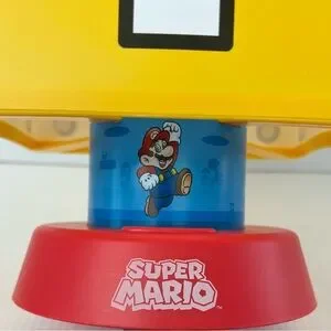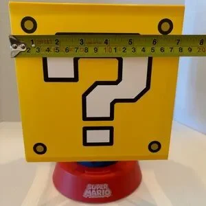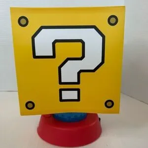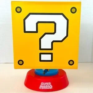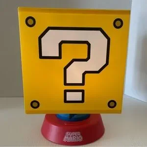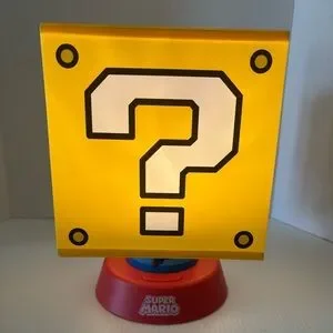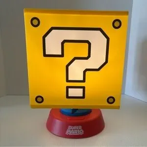 Super Mario Question Mark nightlight with 3 brightness settings and an auto shut off. This light is in good pre-owned condition, no marks but two of the sides are slightly indented. Please see all photos. Doesn’t come with any cords but I just put 3 new AA batteries in it and those will be included. Measures 10” tall and 7” wide. Great for the Mario fan in your life!