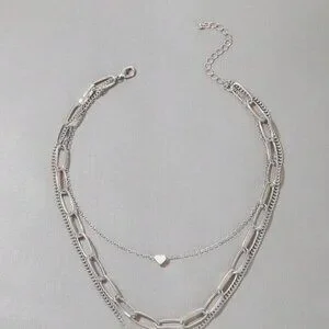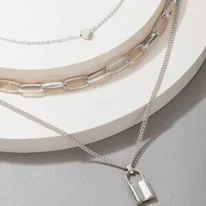 Design: Triple-layer chain featuring a dainty heart pendant, bold oval links, and a lock charm