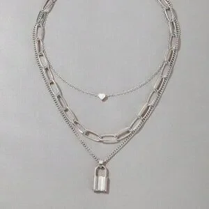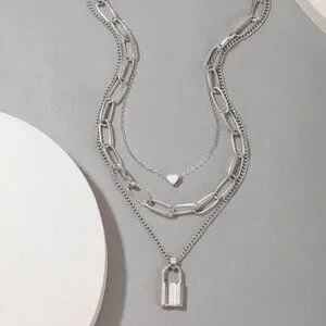 Sterling Silver 3-Layer Chain Necklace | Heart & Lock Pendant