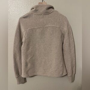 Super comfy light tan jacket with a zip-up front. Ideal for layering, literally goes with everything! Ribbed fabric is everything, and the seaming is super flattering and adds awesome structure and style to this jacket. This one does double duty in fall and spring too!! The oatmeal heather color is such a versatile neutral!