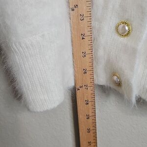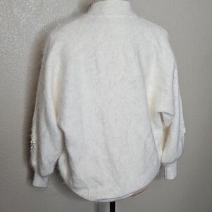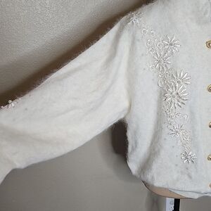 Soft teddy jacket with floral embroidery. Features gold buttons. Perfect for cozy elegance. True Vintage 80s Angora Cream Sweater Cardigan 3D Floral applique embellishments and Pearl Gold Buttons in excellent condition, lined, with light shoulder pads, oversized fit, dolman bubble sleeves, fuzzy rabbit hair wool blend, tagged a medium but could easily fit large as well.