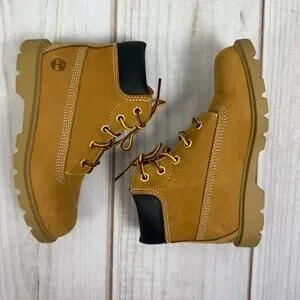 Keywords: Timberland, Toddler boots, Wheat boots, Nubuck leather, Ankle boots, Lace up boots, Kids footwear, Durable boots, Outdoor boots, Casual boots, Brown boots, Yellow laces