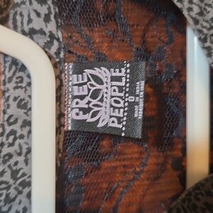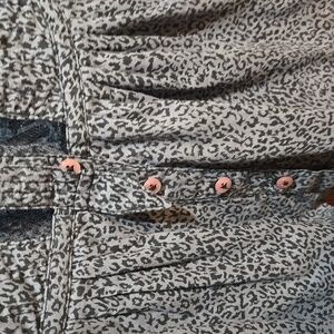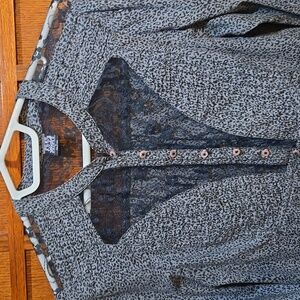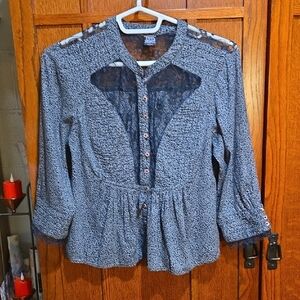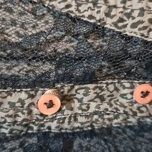 Super cute gray and black patterned button down blouse with black lace on the bodice, back shoulders, and cuffs. The buttons fasten with gray ribbon loops. Each cuff has 3 buttons. I never wore this, and it's lovely!