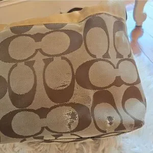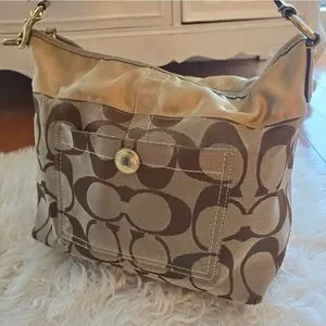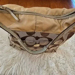 This Coach hobo bag features the iconic 'C' monogram in a sophisticated brown and tan color palette. Crafted with a blend of canvas and leather accents, it offers a chic yet casual look. Ideal for everyday use, this bag combines style and practicality effortlessly.**** Bag is in overall great condition with signs of minor wear as shown in photos.*** Most of the signs of wear are on the back side, which no one should see while wearing the bag. The bag has been cleaned. Still has a lot of life left! Offers welcome!