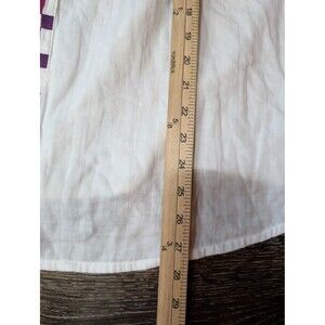 Beautiful lightweight white blouse with purple and plum geometric embroidery on front placket, neckline, and sleeves