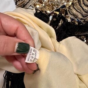 Stunning dress with intricate beadwork and fringe detail. Features gold, black, and blue accents.