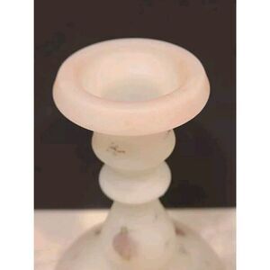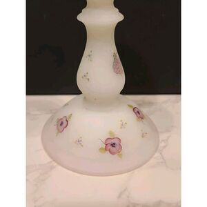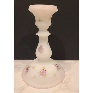 Fenton Glass Berries & Blossoms Candlestick Holder Satin White Custard with a very faint pink around the basr & rim of the top | Only (1) 6" x 4.5" | Excellent Used Vintage Condition | No chips or cracks | Signed by the Artist Bev C. | Please refer to the photos for the condition | Weight before packaging 14oz.