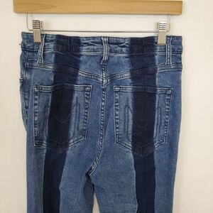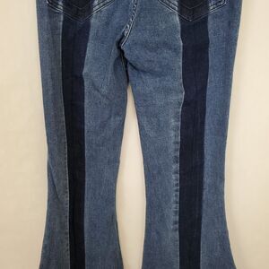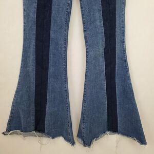 Stylish flare jeans with wide legs. Features a two-tone blue design. Perfect for a chic look.