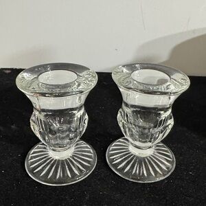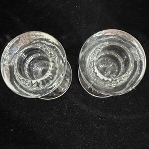 Pair of elegant clear glass candle holders. Perfect for adding a touch of sophistication to any setting.