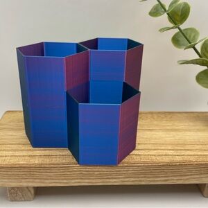 Brand new! Made by me. 🥰 Super functional and super fun hexagonal makeup brush or pen organizer in vibrant blue, pink, and green (at each angle, the light reflects a different color!). This organizer is chic, modern, and minimalist while also bringing some stylish, fun flair due to the ever-changing colors of this piece! Makes a great addition to your desk, bathroom, or vanity. Can be used for makeup brushes, pens/pencils, paint brushes, toothbrushes, etc. The varying heights of the different sections make this very convenient to use. If you purchase more than one, they also fit together, making them an extra efficient, stylish modular organizational system. This is a super lightweight, space-saving choice to meet your clutter-free needs while also displaying your colorful, unique character! Offers are ALWAYS invited in my closet.