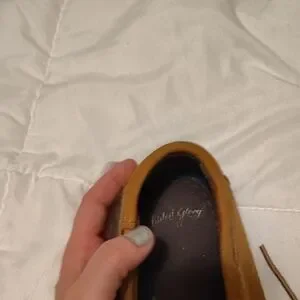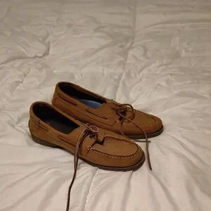 Stylish tan boat shoes with lace-up design. Comfortable and versatile for any outing.