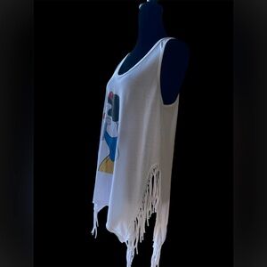 Kavio top in pure white. Soft and breathable material. white, sleeveless tank top featuring a graphic of Disney's Snow White holding an apple, with decorative fringe detailing along the bottom hem. PTP: 20-21” but has stretch.
