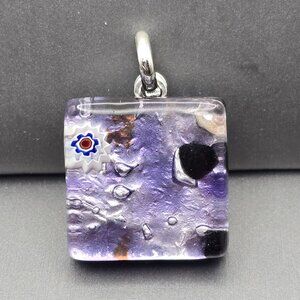 • Design Notes: Purple dichroic shimmer, single Millefiori flower, silver-tone bail, signed Murano