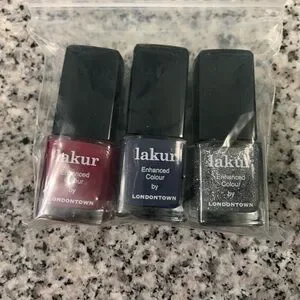 Set of three Londontown Lakur Enhanced Color Nail Polish. Colors include Flirty & Thriving, Midnight Kiss and Tinsel (0.24 oz. each).