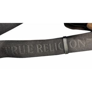True Religion Mini Flap Crossbody Bag Black Gold Horseshoe Hardware. Minor scratches on the horseshoe. Adjustable strap. Magnetic closure. The exterior is pebbled vegan leather. Measurements: