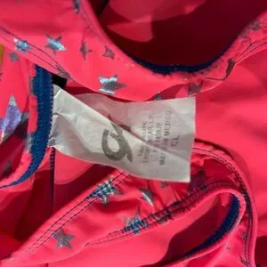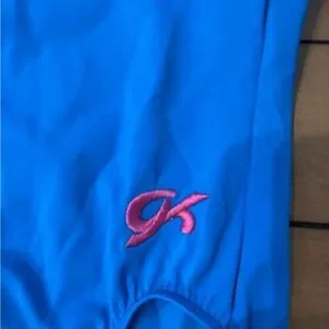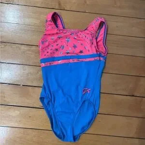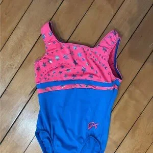 Stylish leotard. Pink on the top with star design. Solid blue on the bottom. Our gymnast found it very comfortable.