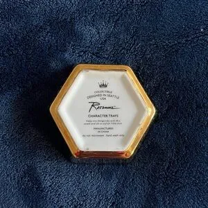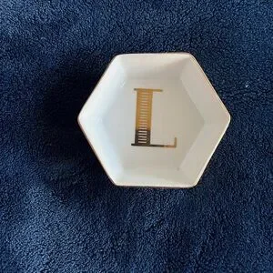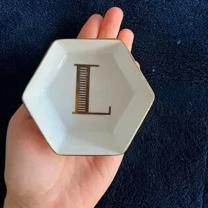 Elegant hexagonal trinket dish featuring a gold accent letter 'L'. Perfect for jewelry or small items.