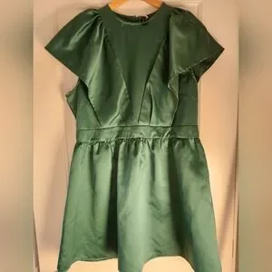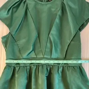 A striking emerald green dress with dramatic flounce sleeves. If you want a dress that accentuates CURVES this is it. Fitted in the waist, the dramatic bodice and sleeves balance with the full skirt to create an hourglass like shape.
