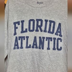Gray t-shirt with 'Florida Atlantic' in blue. Made by Champion.