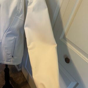 Elegant cream jacket with gray interior. Features The North Face logo. Ideal for versatile wear.