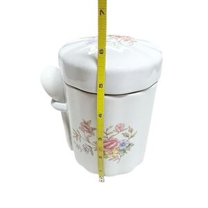 Sweet cottage-core vibes! This Vintage FTD White Floral Ceramic Sugar Coffee Tea Canister Jar with Spoon & Lid features a scalloped design and soft pastel floral bouquet (pinks, blues, yellows, greens) on both the lid and body. Matching spoon rests neatly in a side loopβperfect for sugar, coffee or tea. Tight seal to keep contents fresh.