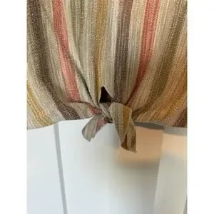The W5 Women's Medium Tie Front Top is a stylish blouse perfect for the fall season. This boho retro-inspired top features a striped pattern, short cap sleeves, and a tie closure for a charming look. The multicolor design adds a fun and vibrant touch, making it an ideal choice for women who love a mix of cottagecore and bohemian styles. Perfect for pairing with jeans or leggings for a trendy and comfortable outfit.